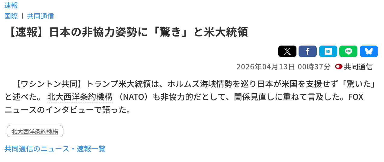 | … | 75無念Nameとしあき26/04/13(月)10:35:35No.1400535199+>共同通信ってオールドメディアの中でも1番信用出来ないオールドメディアだろ |