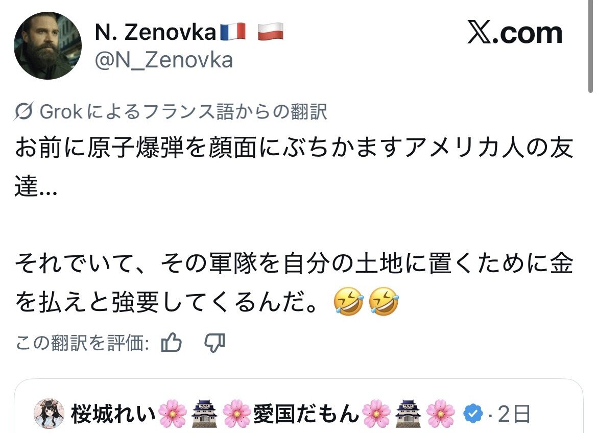 | … | 16無念Nameとしあき26/04/13(月)08:04:16No.1400519657そうだねx8>ヒトモドキにとっちゃ日米分断のチャンスだからな |