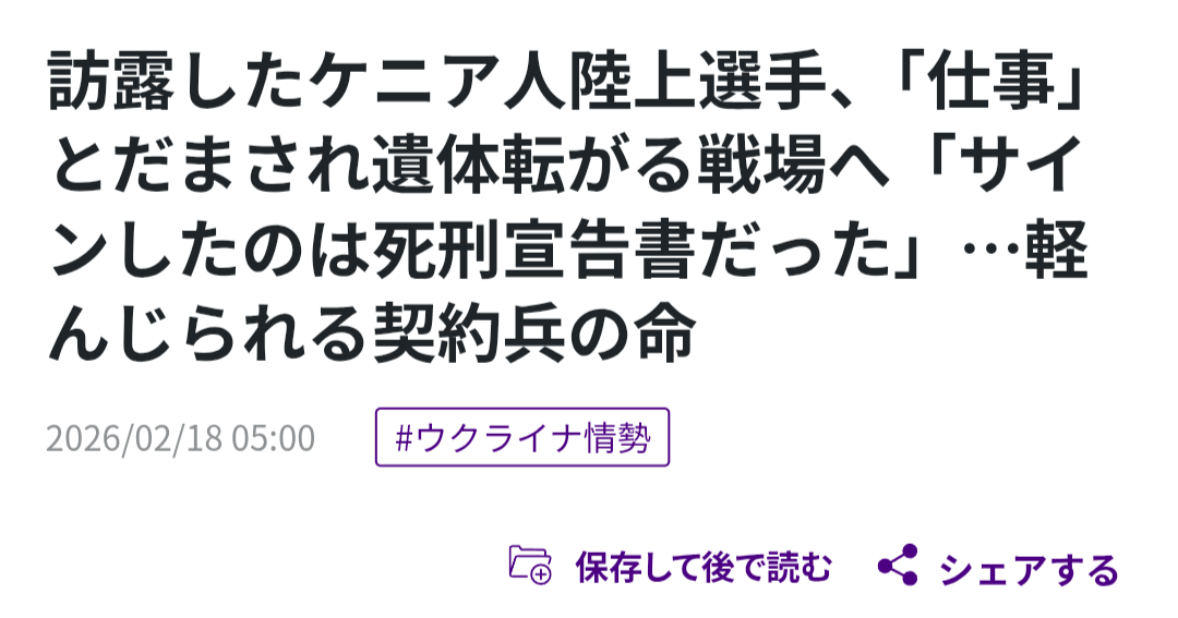 | … | 36無念Nameとしあき26/04/13(月)10:24:41No.1400533972+騙されて戦争の最前線へ送り込まれてるインド人やインドネシア人と比べたらまだマシだったのでは・・・ |
