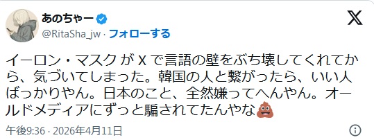 | … | 28無念Nameとしあき26/04/13(月)11:00:24No.1400537966+世界でどの国を信用したいかと聞かれれば韓国しか無いわけだが |