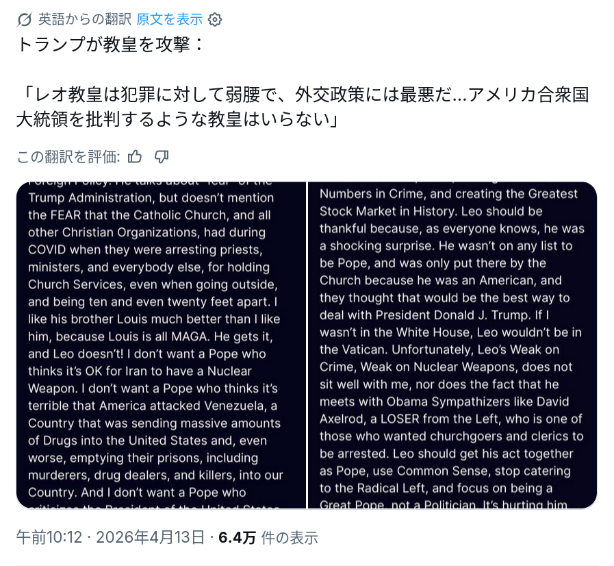 | … | 23無念Nameとしあき26/04/13(月)11:22:28No.1400540477+たぶんアメリカ人教皇だから自分の命令を素直に聞くと思ってたんだろ… |