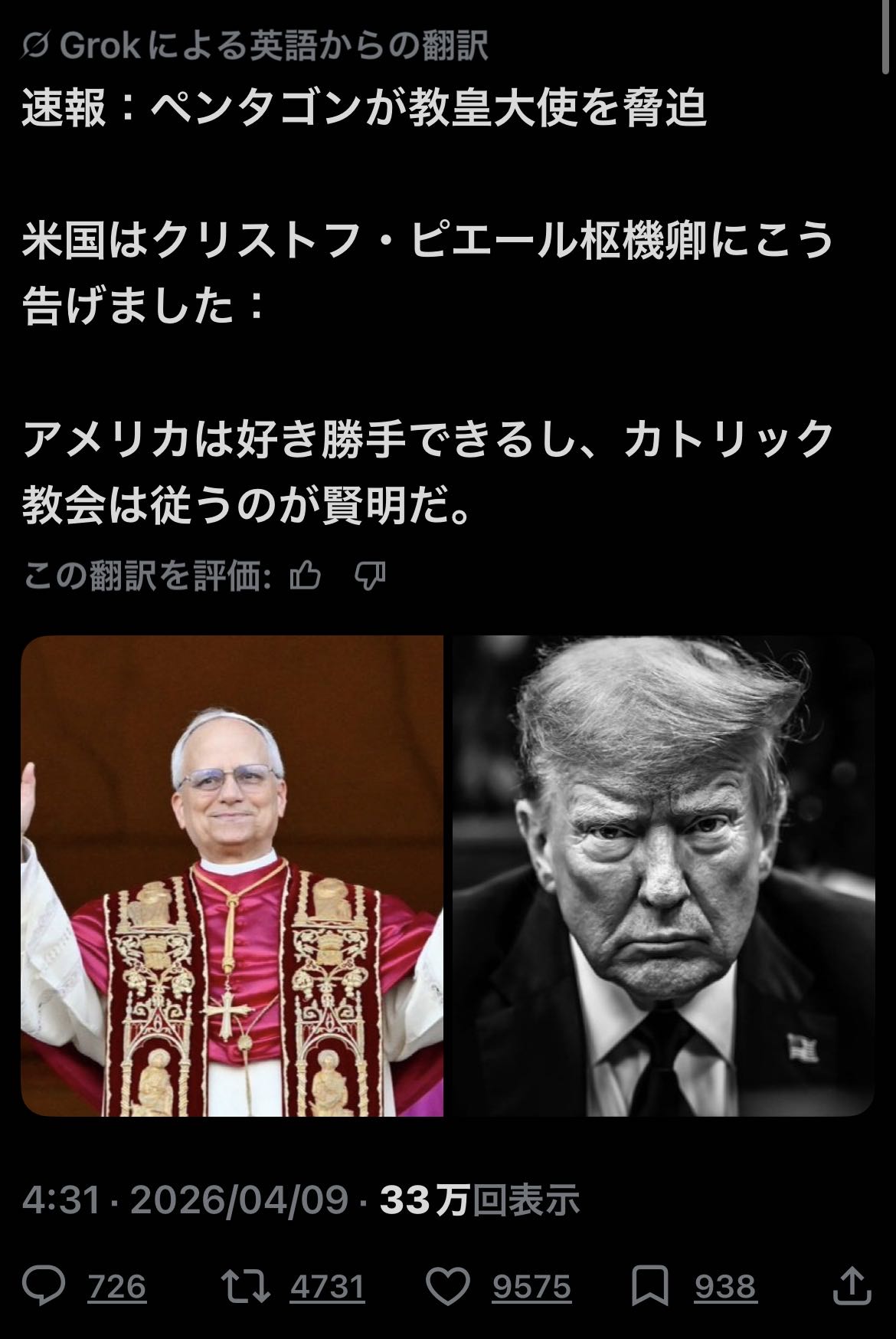 | … | 39無念Nameとしあき26/04/13(月)12:07:49No.1400546883そうだねx2>アメリカに逆らう教皇なんか要らん!!!!! |