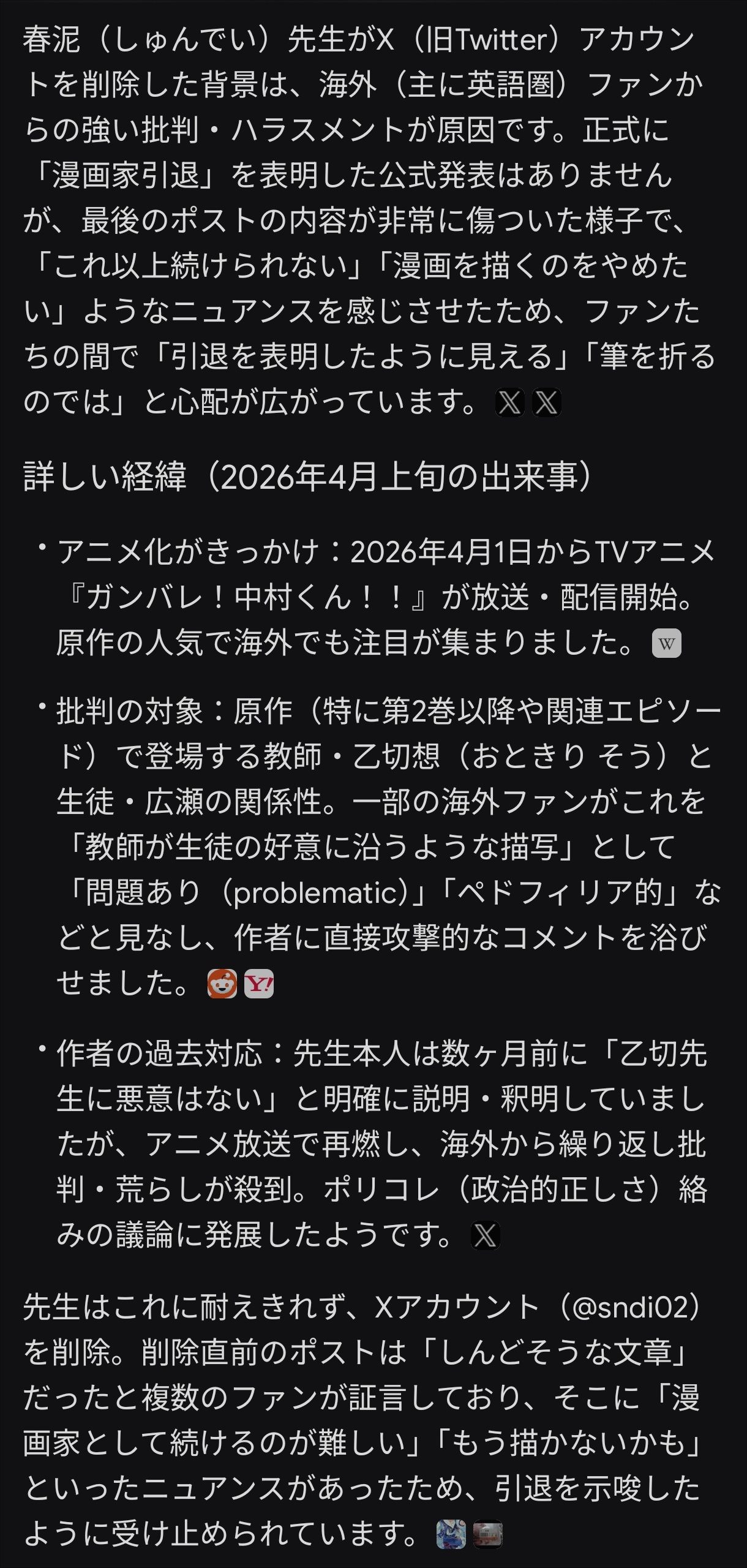 | … | 47無念Nameとしあき26/04/13(月)16:11:23No.1400586586そうだねx2>作者が海外のフェミニストに「未成年を性的に描くペド作家」と批判されSNS垢消し |