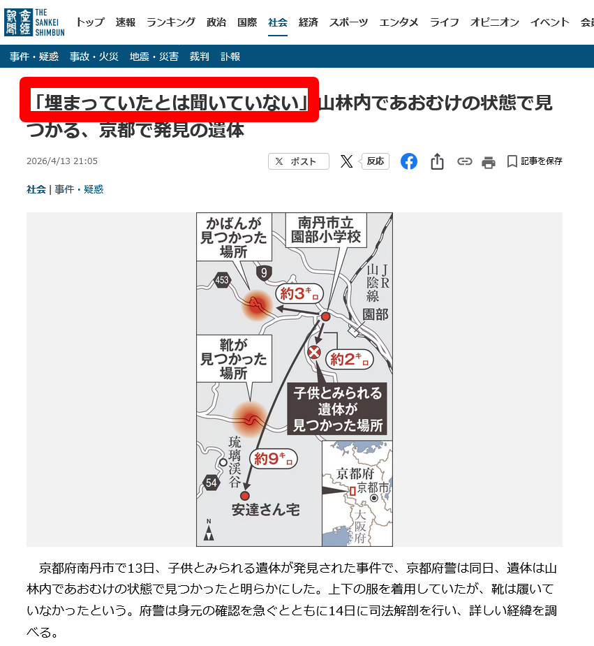 | … | 932無念Nameとしあき26/04/14(火)00:04:41No.1400704134+>>京都府警の説明だと違う子の死体っぽいな |