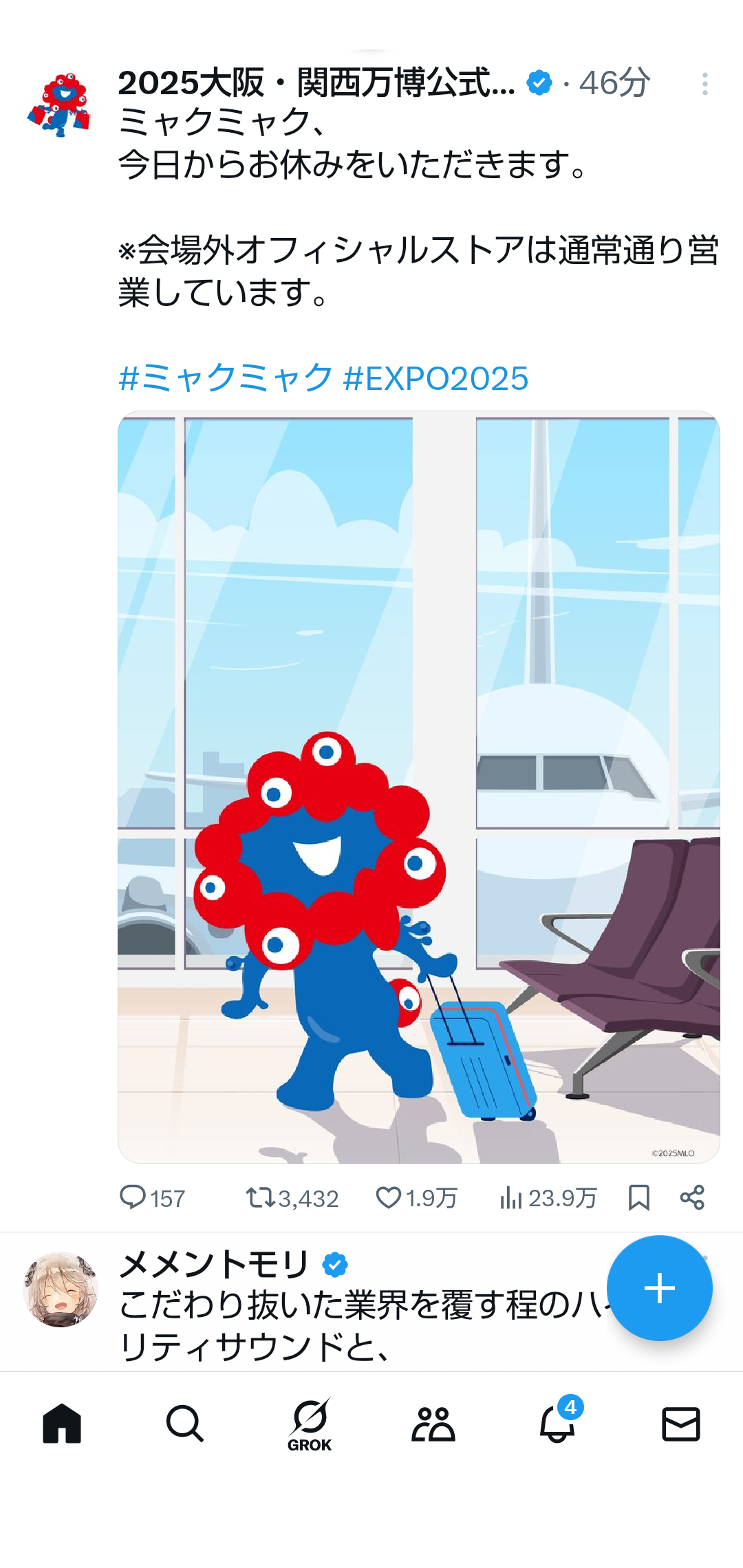 | … | 10無念Nameとしあき26/04/14(火)11:51:54No.1400765578+ 1776135114926.jpg-(313994 B) 2025年の大役を務めたミャクミャクが向かったのは、沖縄。青い空と透き通る海に包まれながら、ゆっくりと過ごす2泊3日の小さな旅。 |