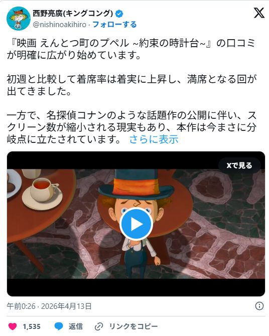 | … | 80無念Nameとしあき26/04/14(火)13:20:51No.1400783108そうだねx1西なんとかさんがやらなきゃいけないのは毎日日本全国どこかの映画館に現れるとかなはずなんだよ |