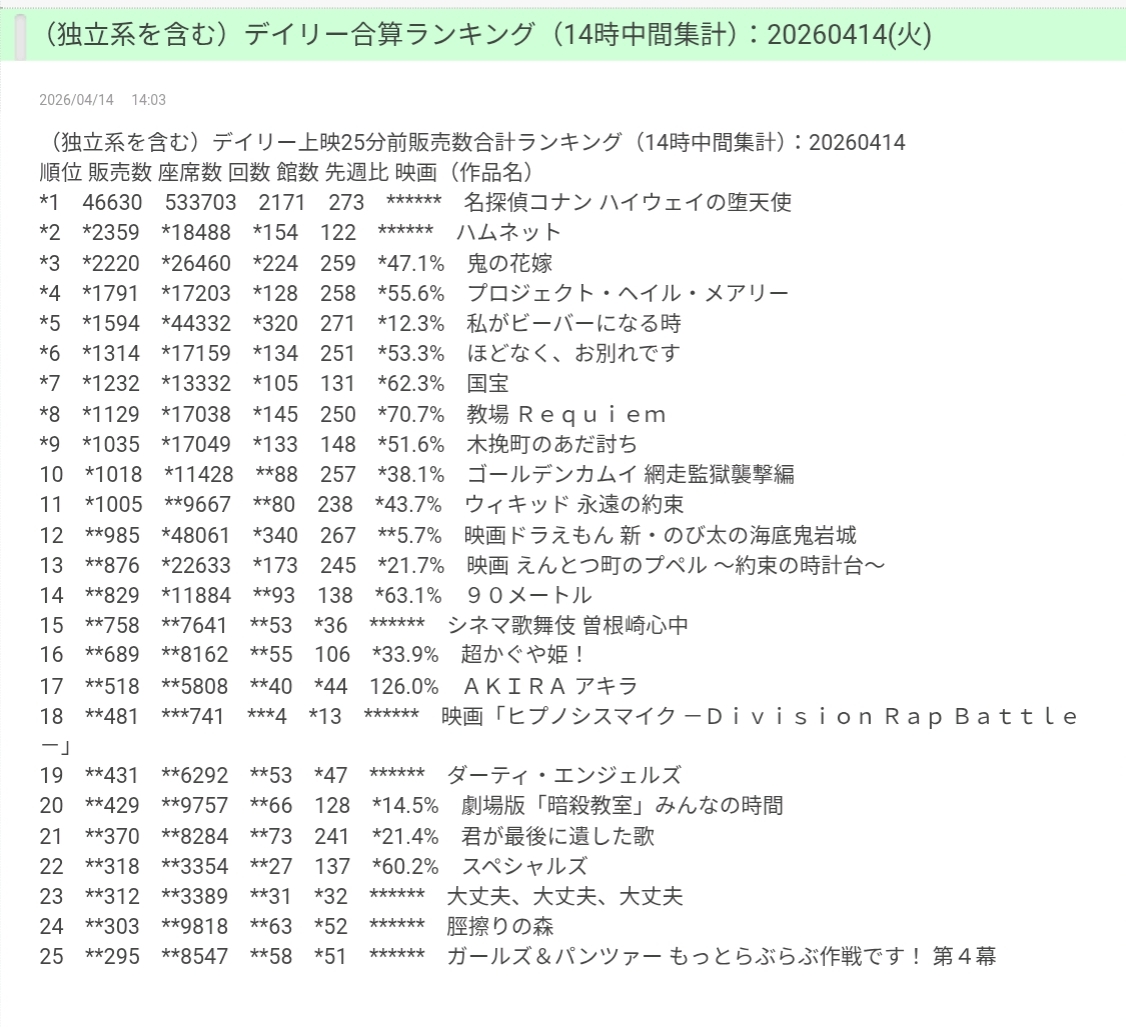 | … | 133無念Nameとしあき26/04/14(火)14:01:18No.1400789754+>興行収入 〜4/12 |