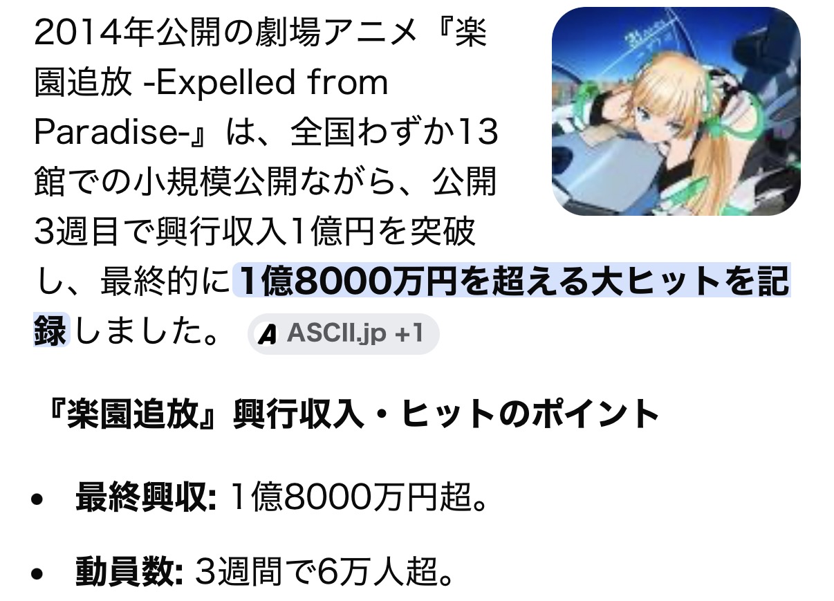 | … | 157無念Nameとしあき26/04/14(火)14:18:53No.1400792421+ 1776143933204.jpg-(200642 B) 楽園追放の前作は1億8000万だから3億いったら大健闘だな |