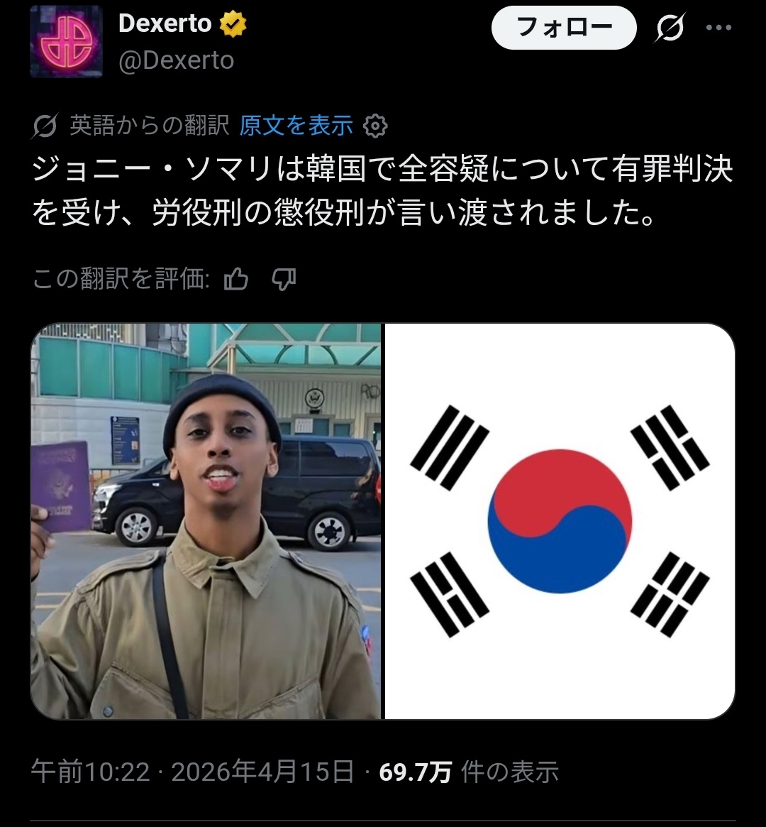 | … | 41無念Nameとしあき26/04/15(水)13:30:49No.1401010097そうだねx2>ジョニー・ソマリさん、無事有罪判決 |