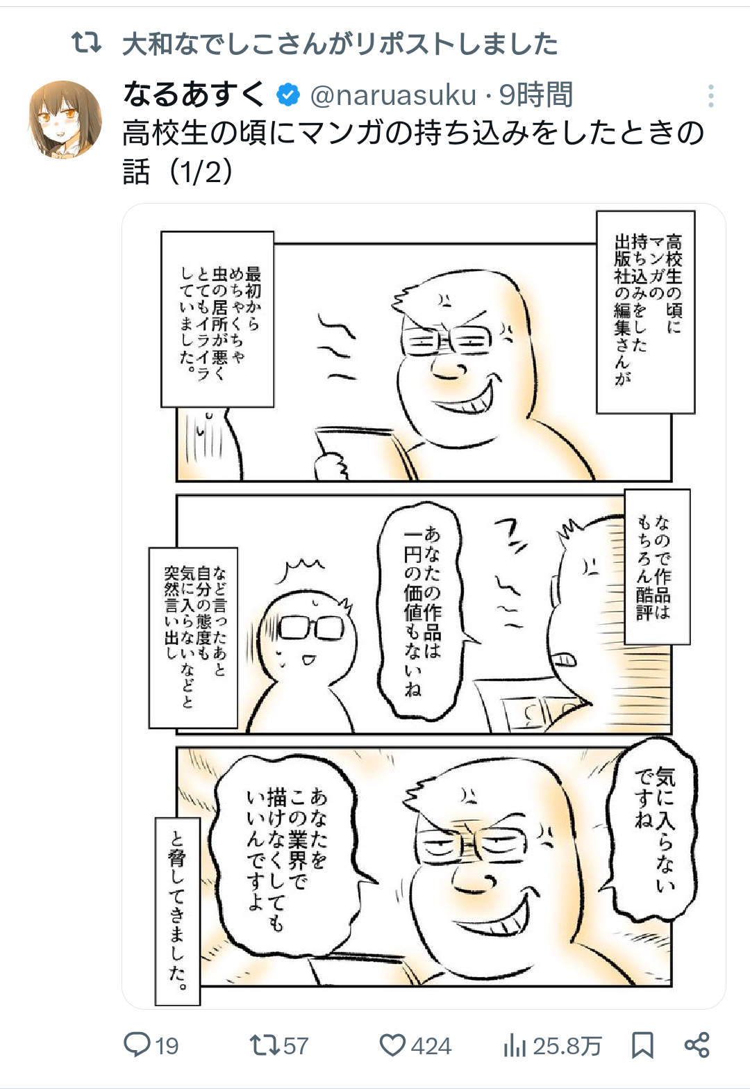 | … | 137無念Nameとしあき26/04/15(水)23:39:26 IP:103.2.*(bc9.ne.jp)No.1401154685+ 1776263966386.jpg-(145981 B) >昔会ったクソ編集者みたいな漫画を描いてる人はだいたいその時漫画家を諦めれば良かったのにと思うような人 |