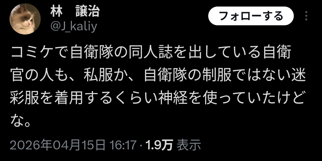 | … | 74無念Nameとしあき26/04/16(木)10:16:46No.1401214753+>コミケで自衛隊の同人誌を出している自衛官の人も、私服か、自衛隊の制服ではない迷彩服を着用するくらい神経を使っていたけどな。 |