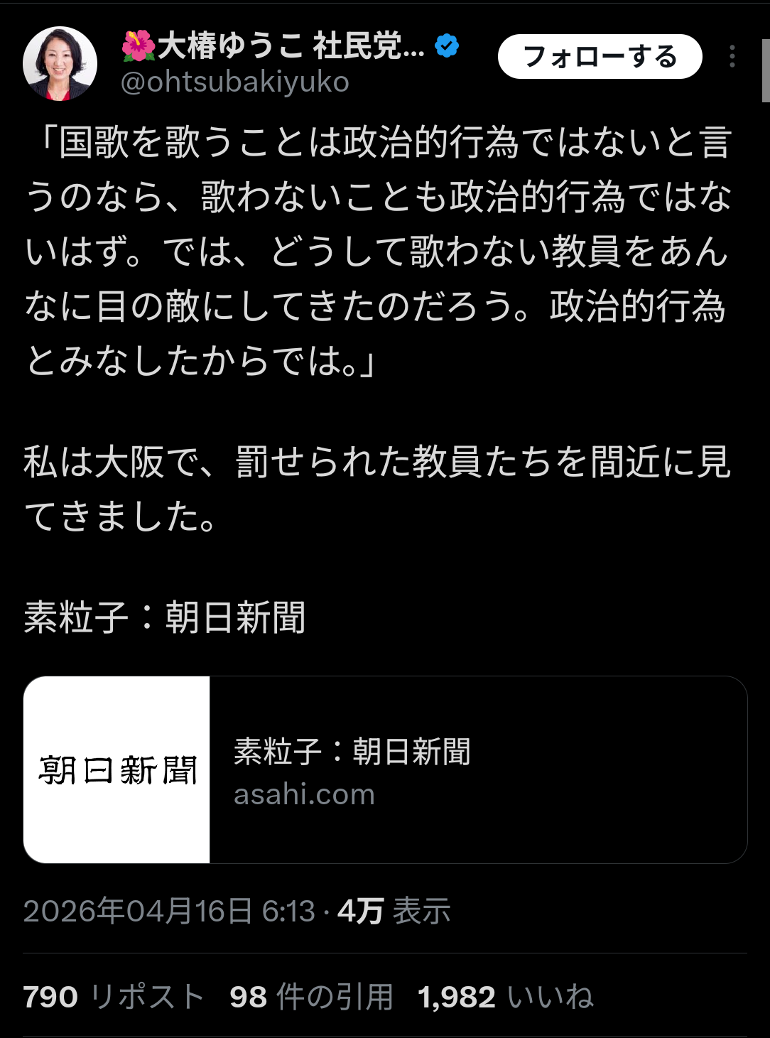 | … | 9無念Nameとしあき26/04/16(木)08:22:35No.1401201431そうだねx1>国歌斉唱が政治行為ではないというなら、卒業式で国歌で起立しなかった教師を処分する根拠は? |