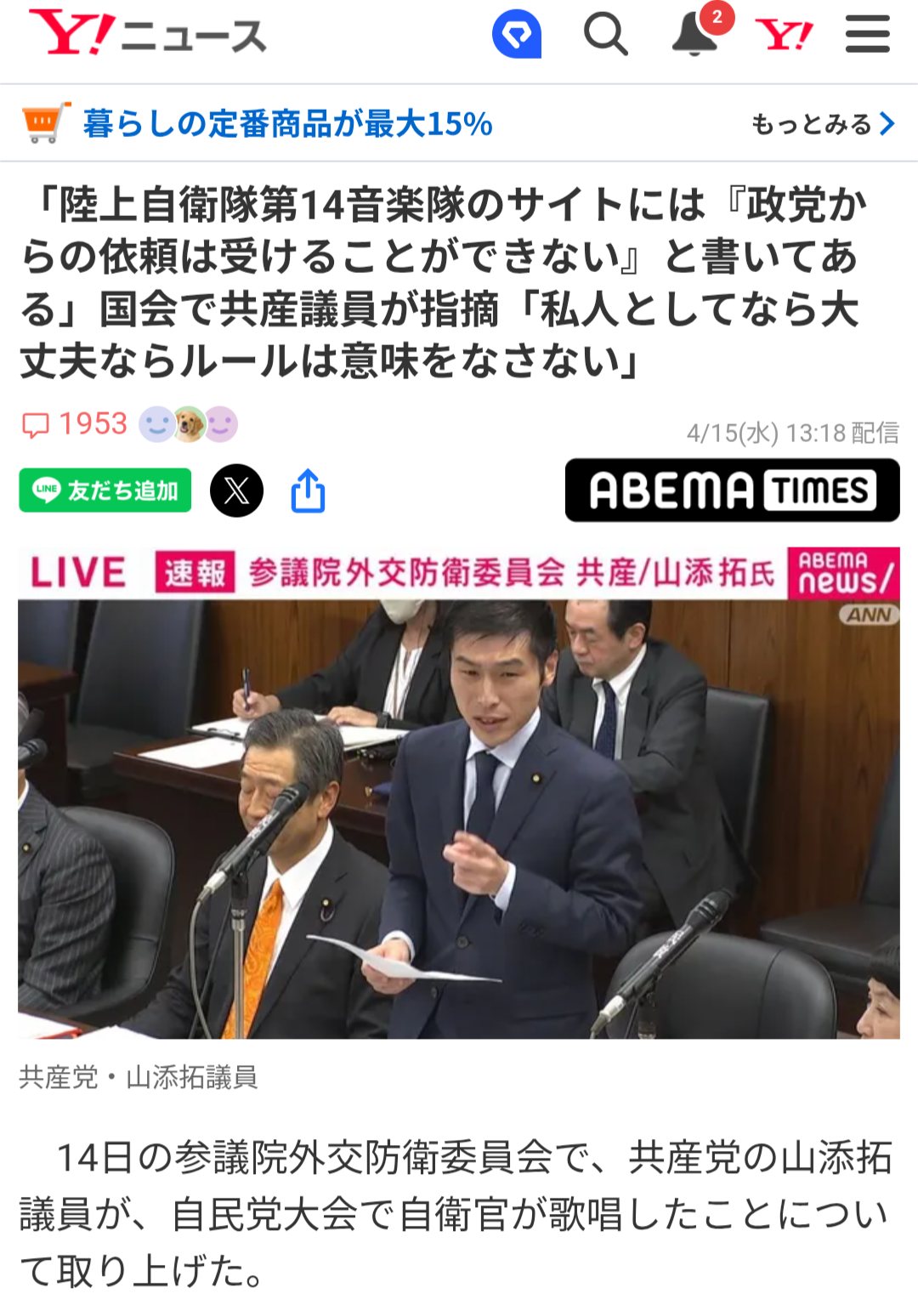 | … | 86無念Nameとしあき26/04/16(木)10:43:52No.1401218239そうだねx1個人で参加したのに自衛官と名乗って制服着て歌った人に対して何かしらの処分を行うべきだし |