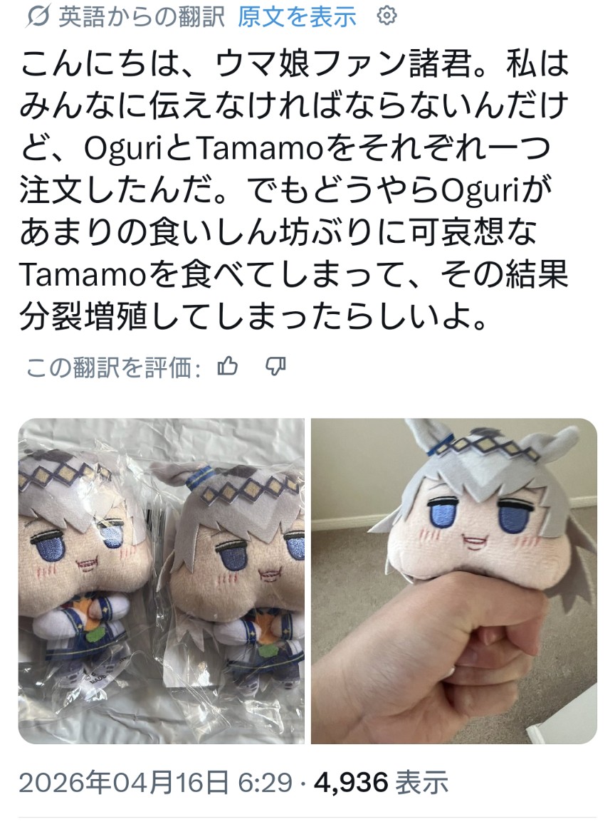 | … | 82無念Nameとしあき26/04/16(木)12:38:42No.1401237323そうだねx2たまに有名ハリウッド俳優がウマ娘にハマってそのTシャツ着てるとかコラが真実であるかのように流れたりするので海外アカウントから情報は半分ガセかもって気持ちで見た方がいいぽん |