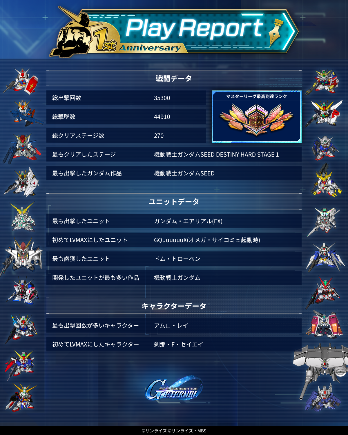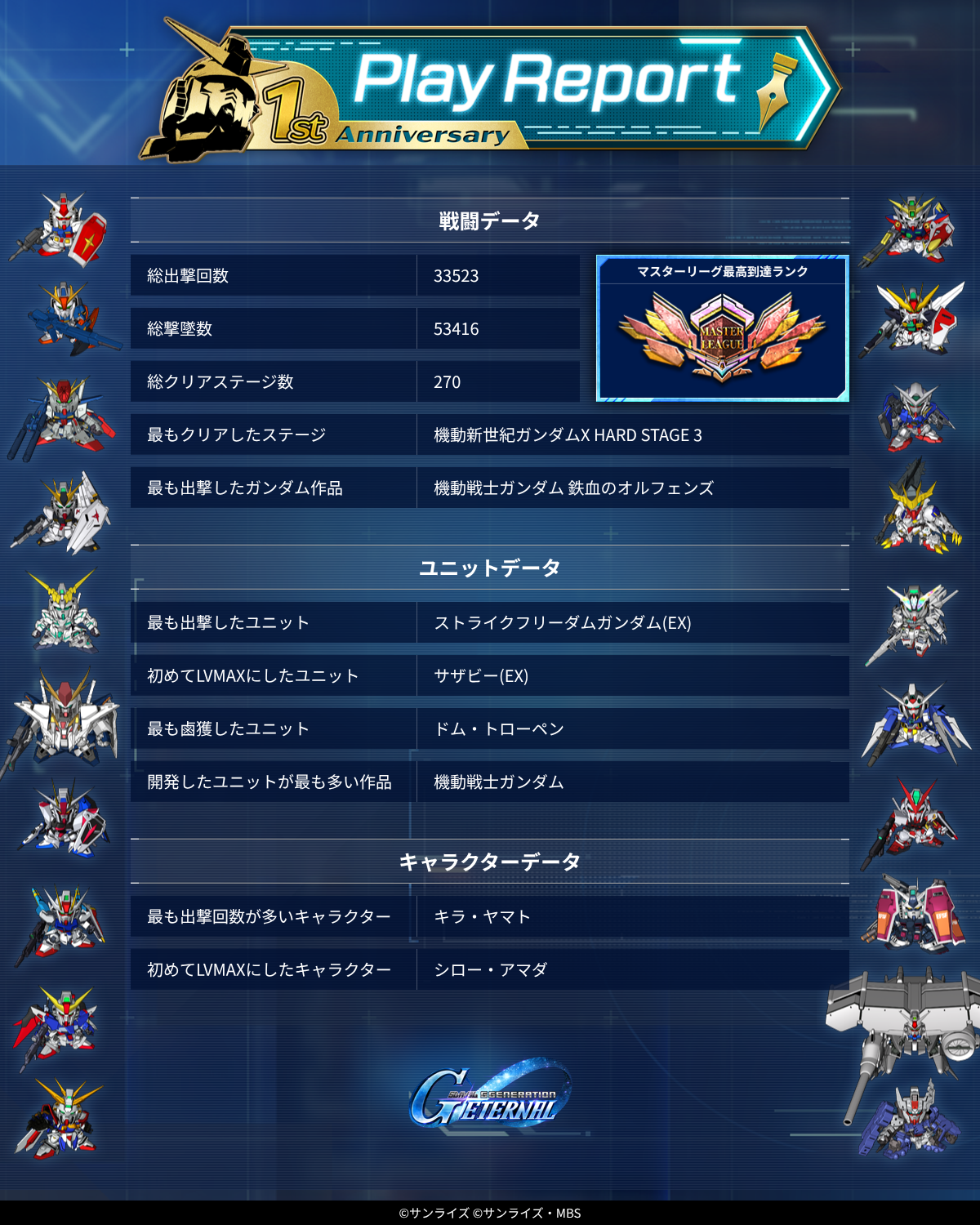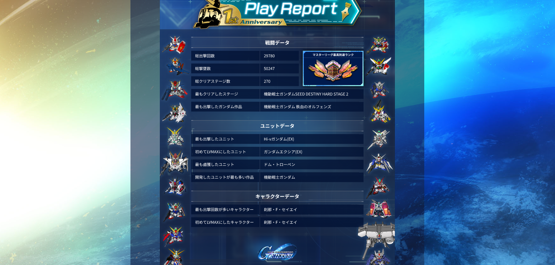 | … | 17無念Nameとしあき26/04/16(木)13:27:30 ID:8X5Og3I6No.1401246631そうだねx1 1776313650971.png-(1783145 B) 最多出撃数もエクシアだったらな |