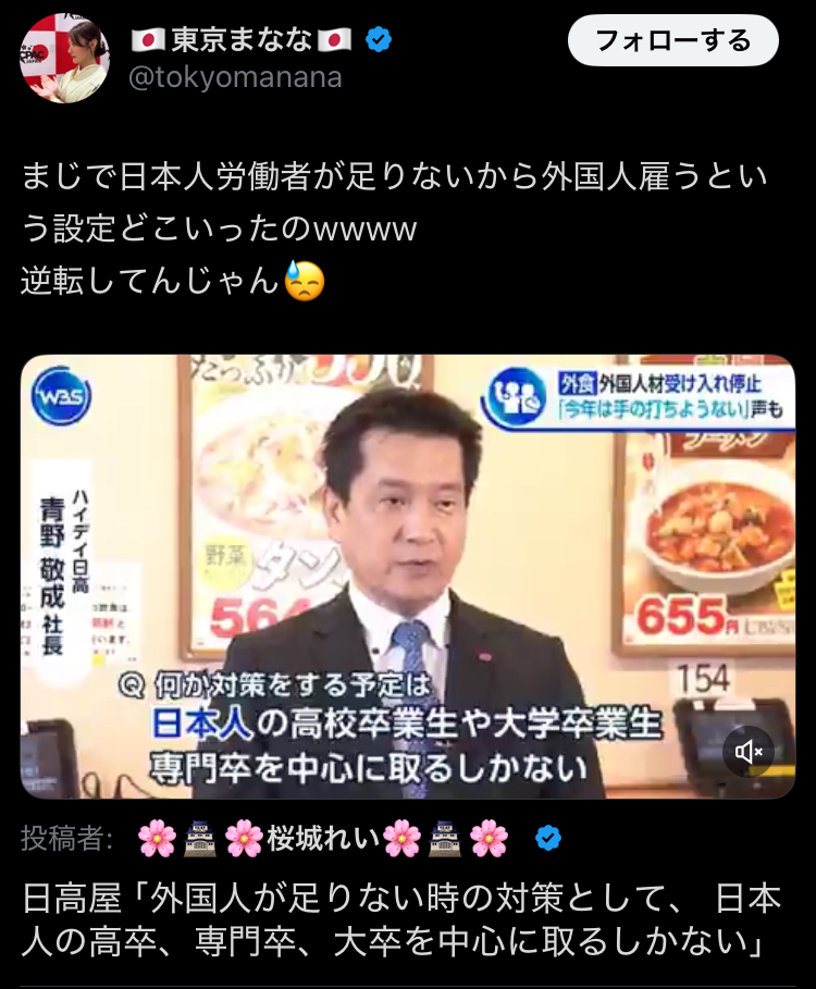 | … | 37無念Nameとしあき26/04/17(金)00:18:02No.1401383218+>特定技能が採用できなくなったので苦肉の策でしょうがなく日本人を採用しますと宣言 日高屋 |