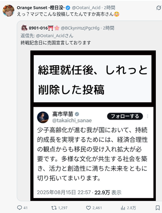 | … | 71無念Nameとしあき26/04/17(金)00:46:53No.1401387474+そもそも外人なんて入れなくても人では足りてるのにと白状してるのが今回の発言だろ |