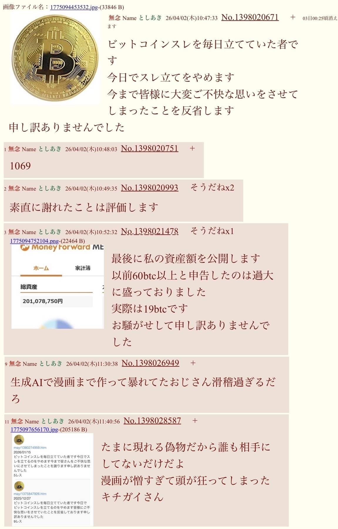 | … | 77無念Nameとしあき26/04/17(金)13:58:16No.1401462098+ビットコインスレじゃなくて漫画貼りキチガイを叩くスレになってるな |