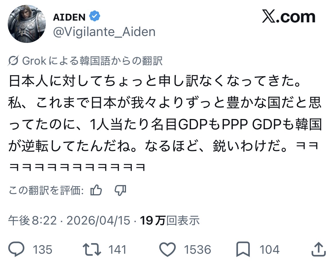 | … | 38無念Nameとしあき26/04/17(金)14:32:04No.1401466549+2024年のGDPが 日本634兆円 韓国290兆円 |