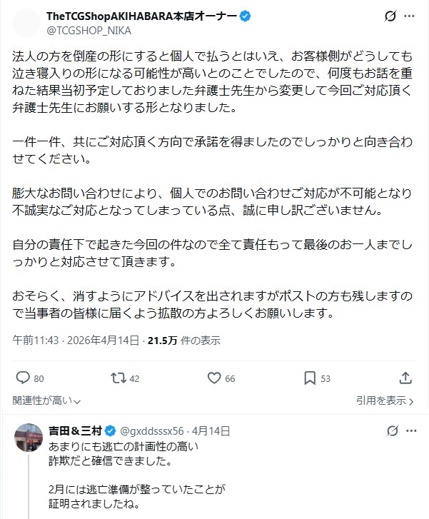 | … | 16無念Nameとしあき26/04/17(金)22:45:22No.1401575211+似たような手口で潰れたTCGショップ最近あったような |