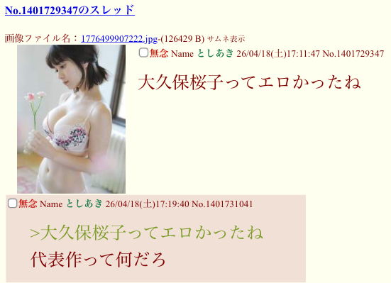 | … | 56無念Nameとしあき26/04/18(土)22:00:30No.1401810277そうだねx1>『久保』で調べてくるから |