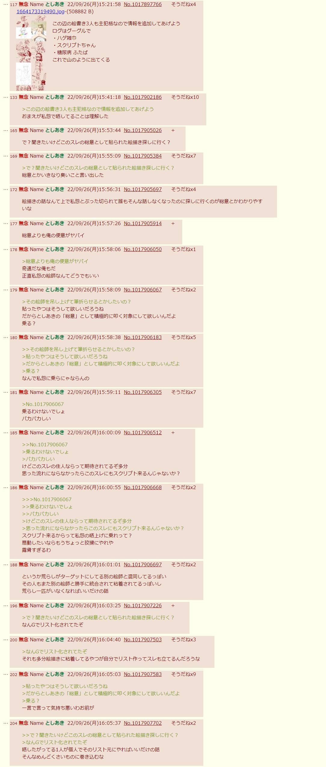 | … | 35無念Nameとしあき26/04/18(土)22:28:28No.1401819110そうだねx5>>自作絵スレ荒らしてクリエイターに粘着する無産野郎が夢を語るなボケ |