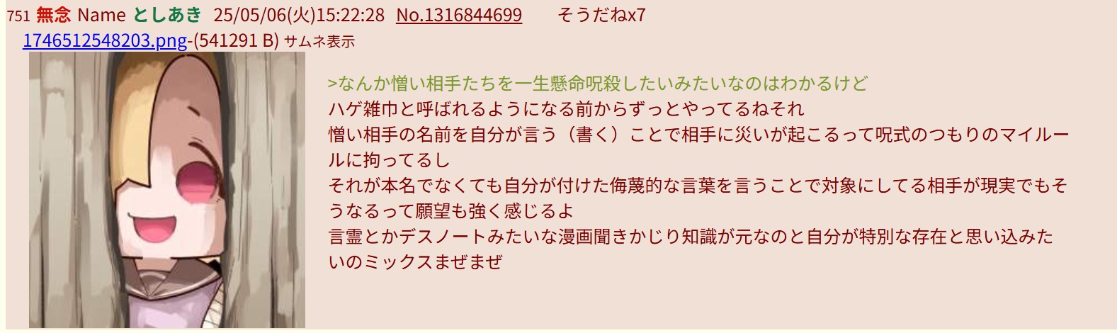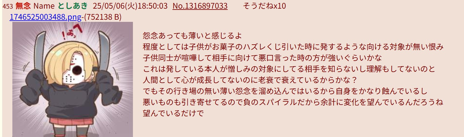 | … | 242無念Nameとしあき26/04/18(土)23:31:01No.1401836992そうだねx1>「呪い」ってのは荒らしの類や本物のクズに苦しめられた人にしか使うことができないスキルだと思う |