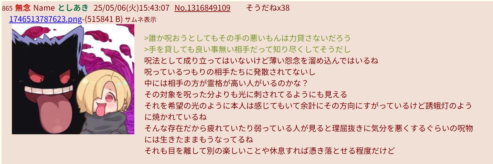 | … | 206無念Nameとしあき26/04/18(土)23:14:36No.1401832571+ 1776521676841.jpg-(210579 B) 霊感オカルトあきによるスレ豚の呪いへの評 |
