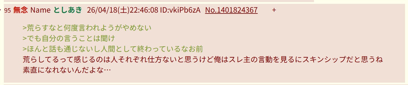 | … | 287無念Nameとしあき26/04/19(日)00:02:22No.1401845060そうだねx4自分が気に食わないから荒らすというだけだしな |