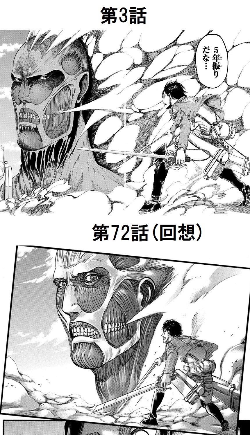 | … | 30無念Nameとしあき26/04/19(日)00:16:35No.1401847916+ 1776525395599.jpg-(608182 B) 「進撃の巨人」で描写済みのシーンが回想される場面だと、旧絵のコピペをせずに新規に描くのがデフォになってる印象(自分が覚えてないだけでコピペのシーンもあったりするのかもしれないけど) |