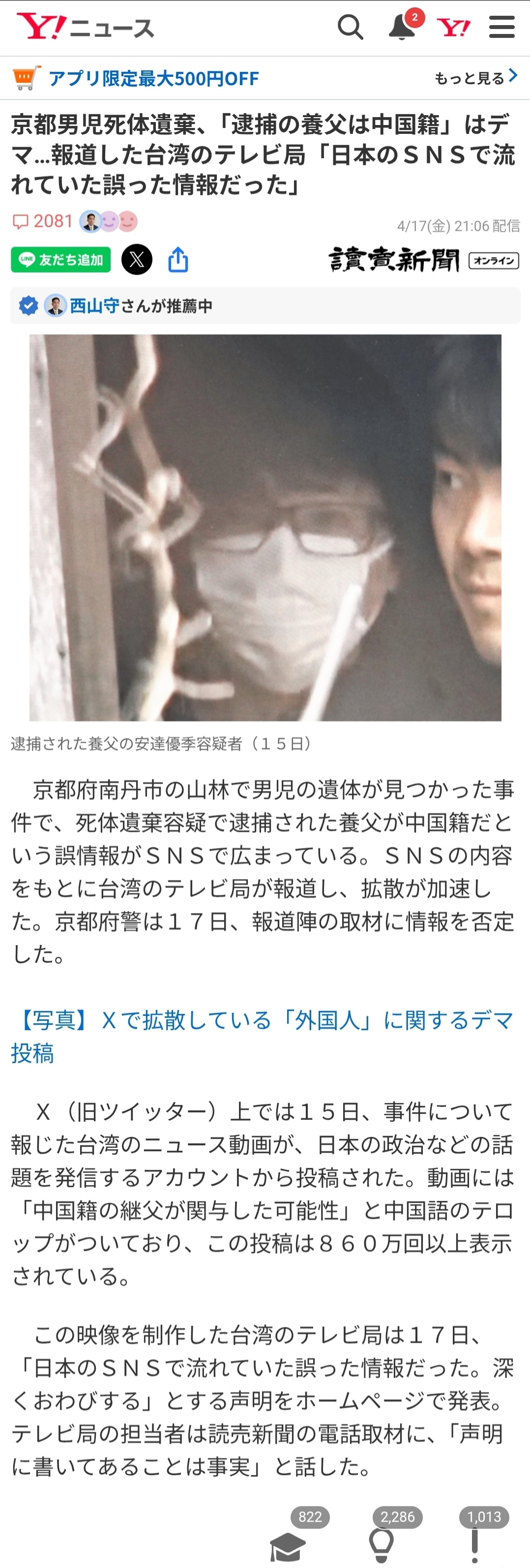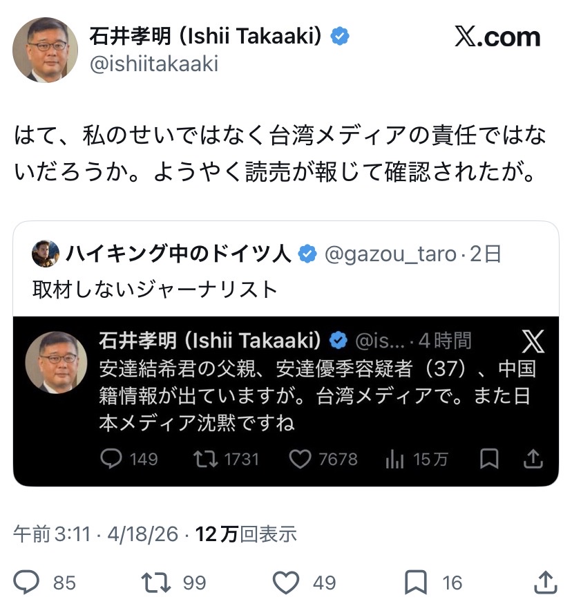 | … | 16無念Nameとしあき26/04/19(日)05:35:20No.1401874092+台湾のメディアはなぜコイツは中国人だと断定したのか |