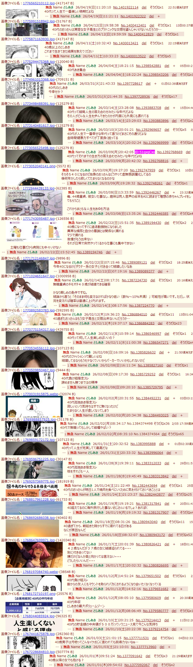 | … | 5無念Nameとしあき26/04/19(日)11:34:54No.1401925104そうだねx2>40代って人生で一番楽しい時期だよね |