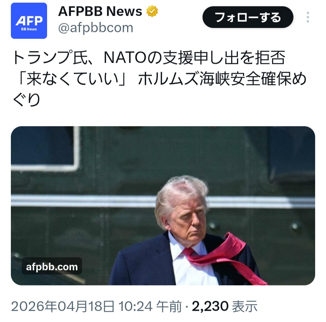 | … | 24無念Nameとしあき26/04/19(日)21:04:50No.1402070522そうだねx8日本は助けなかったNATOが協力しなかったってゴネる癖に |