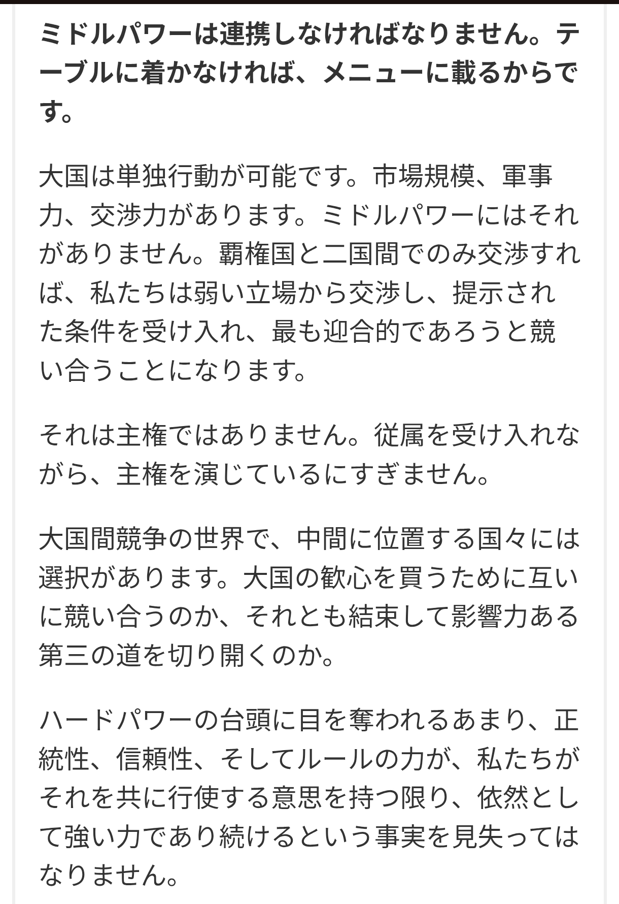 | … | 39無念Nameとしあき26/04/20(月)11:20:17No.1402177140そうだねx3国際秩序は形だけのものなのでミドルパワーは連携してハードパワーに対抗するしかないって言いたいのか |