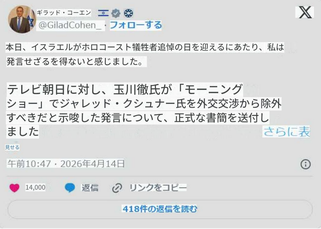 | … | 31無念Nameとしあき26/04/20(月)11:13:59No.1402176329そうだねx2イスラエルが悪者ダカラーにしたくても玉川の発言がイスラエル人じゃなく祖父母の代からアメリカ人のユダヤ人なんで普通に人種差別 |