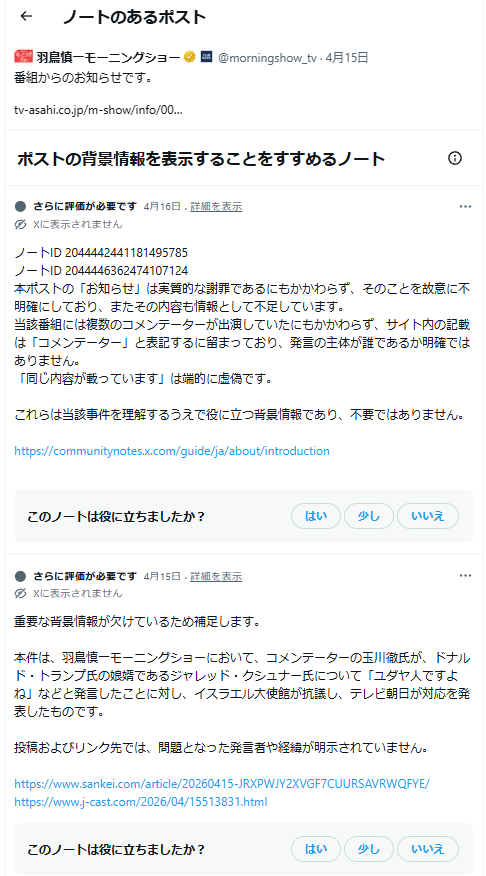 | … | 17無念Nameとしあき26/04/20(月)11:00:27No.1402174507+何回謝っても玉川さんはやらかすな |