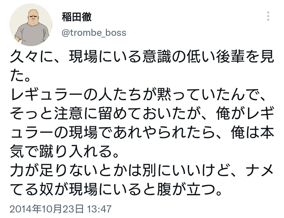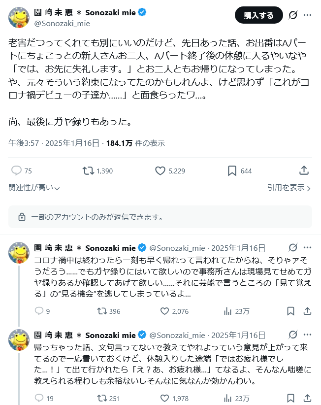 | … | 495無念Nameとしあき26/04/20(月)18:46:56No.1402256638+最低限役者として求められることくらいはしようねってことくらいしか言ってないから仕事はちゃんとしろよくらいの愚痴にしか見えんな |