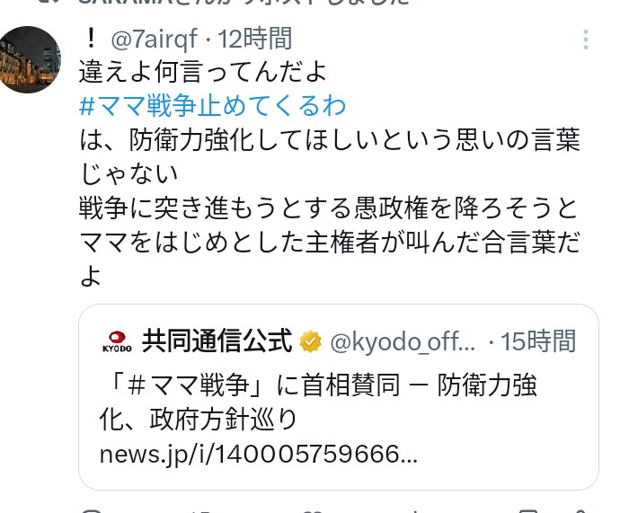 | … | 109無念Nameとしあき26/04/20(月)22:32:09No.1402316628+>>先ず自分達に賛同しない側は戦争賛成だと思ってる時点で終わってんのよ |