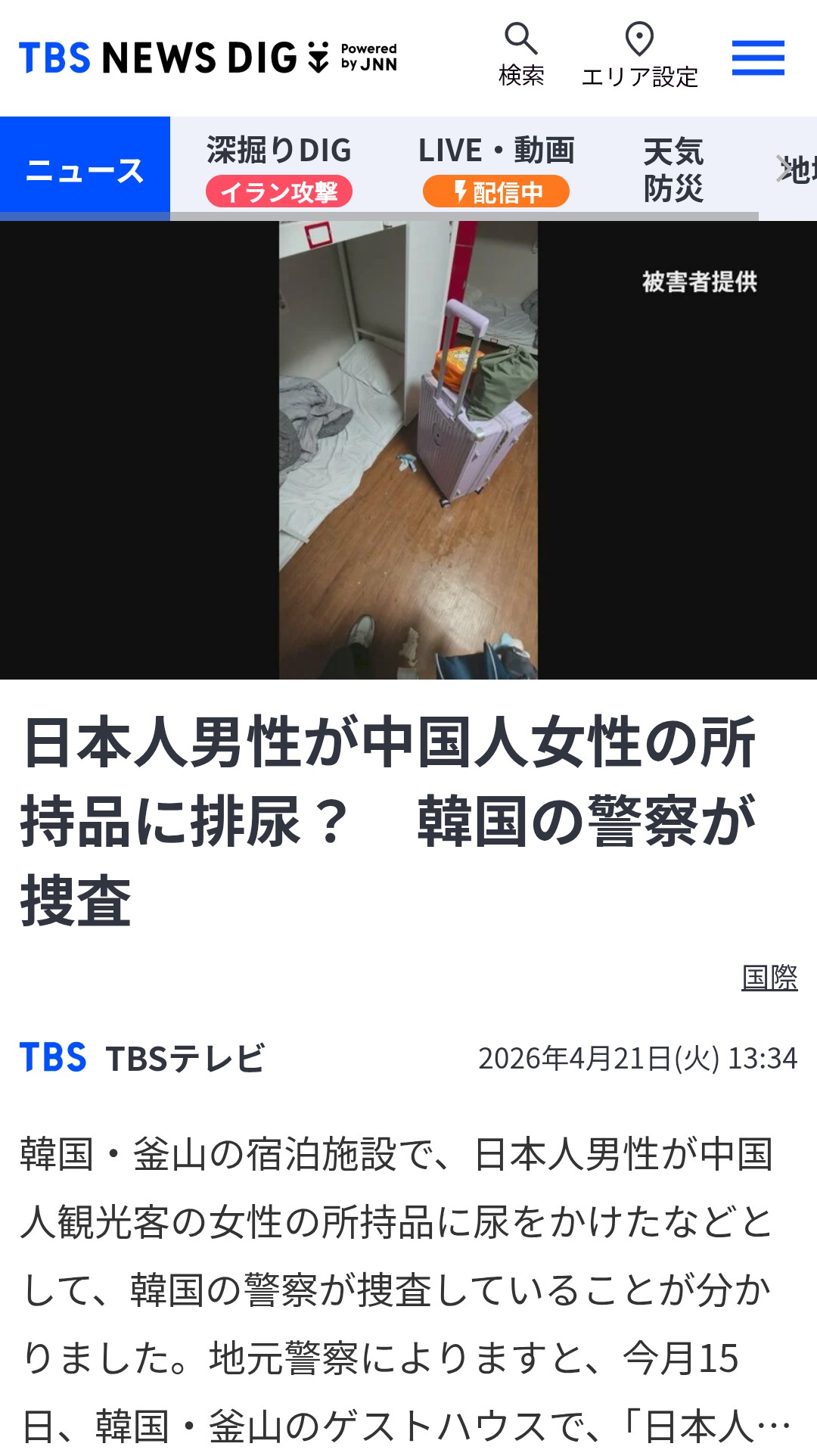>地元警察によりますと、今月15日、韓国・釜山のゲストハウスで、「男性が同じ部屋の中国人女性のベッドや所持品に排尿をした」などと通報がありました。
