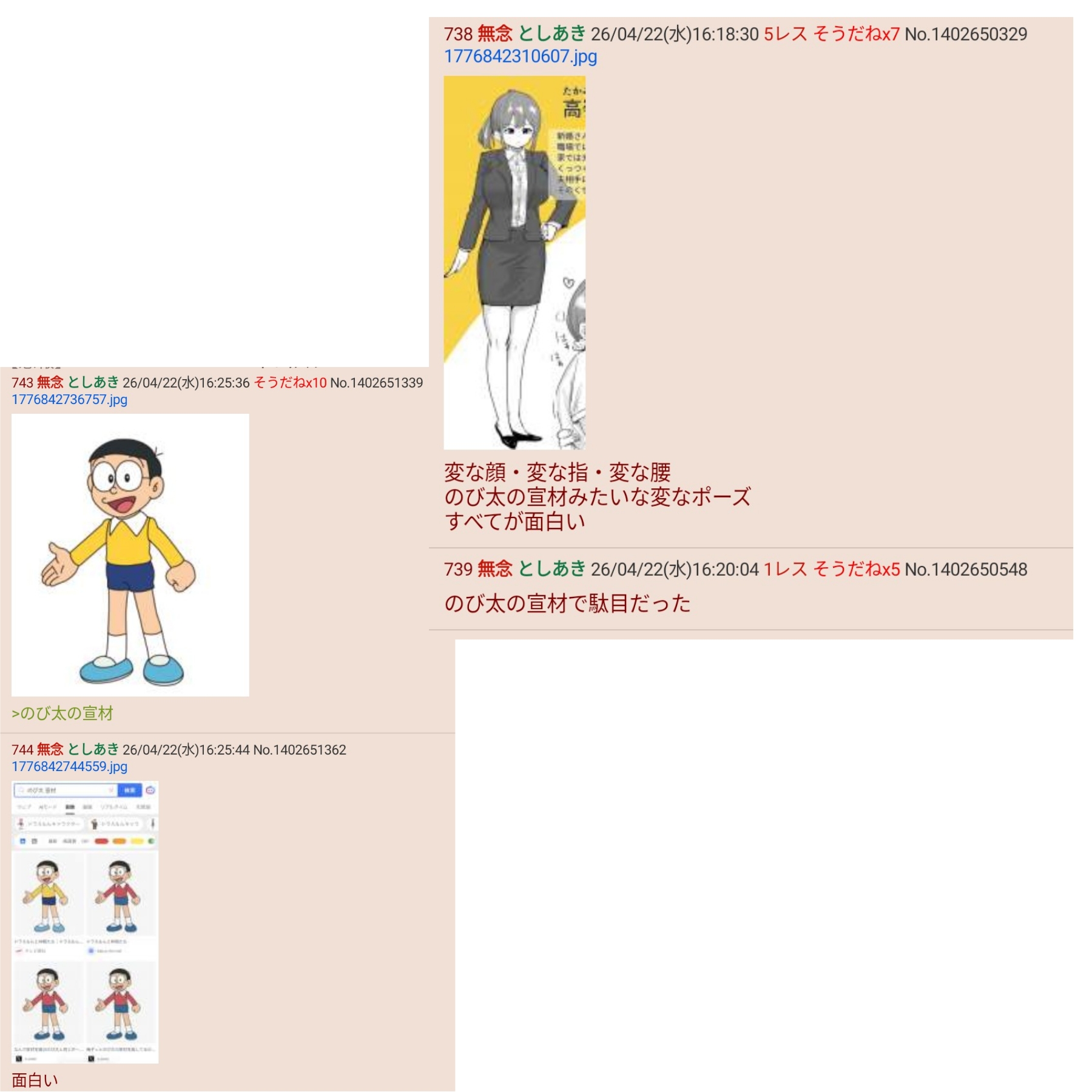 | … | 42無念Nameとしあき26/04/22(水)18:01:42No.1402666853そうだねx1 1776848502719.png-(39687 B) >前スレののび太ポーズ突っ込みは良かった |
