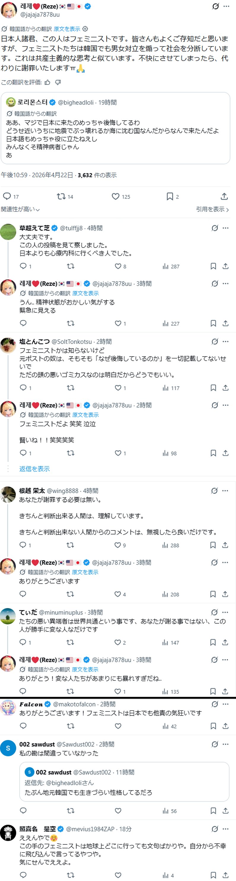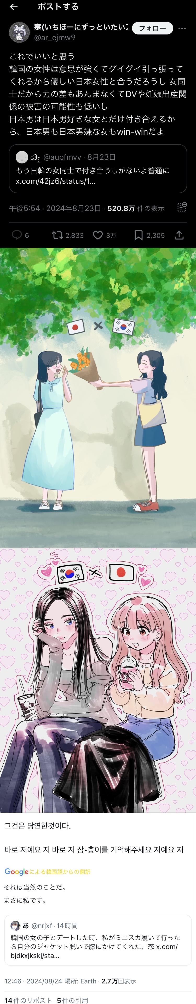 | … | 8無念Nameとしあき26/04/23(木)07:30:41No.1402788306+ 1776897041601.jpg-(1375605 B) 【悲報】フェミ「日韓のオスゴミすぎ。日本人女性は韓国の女性と交際すればよい」3万いいねの大共感 |