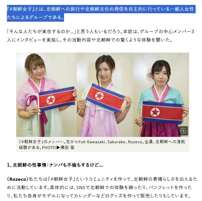 | … | 10無念Nameとしあき26/04/23(木)07:32:04No.1402788439+ 1776897124522.jpg-(101520 B) 『#朝鮮女子』とは、北朝鮮への旅行や北朝鮮文化の発信を自主的に行っている一般人女性たちによるグループである。 |