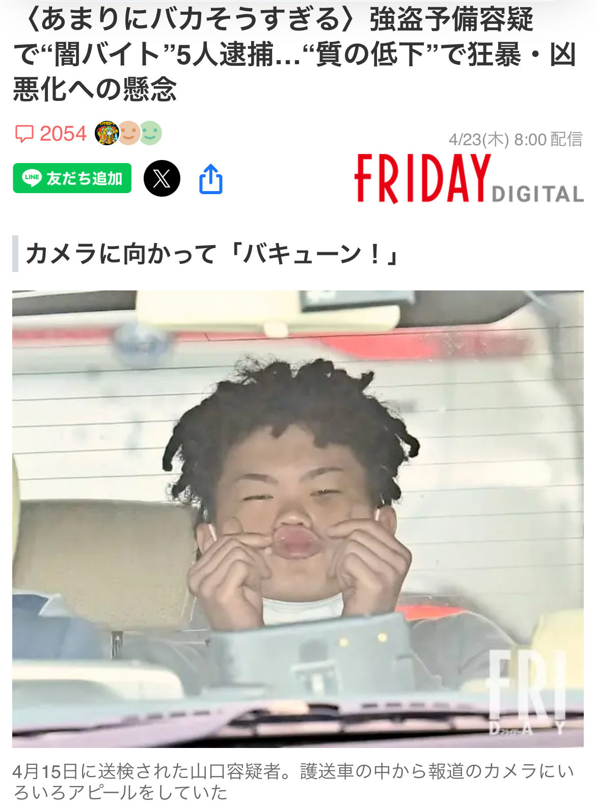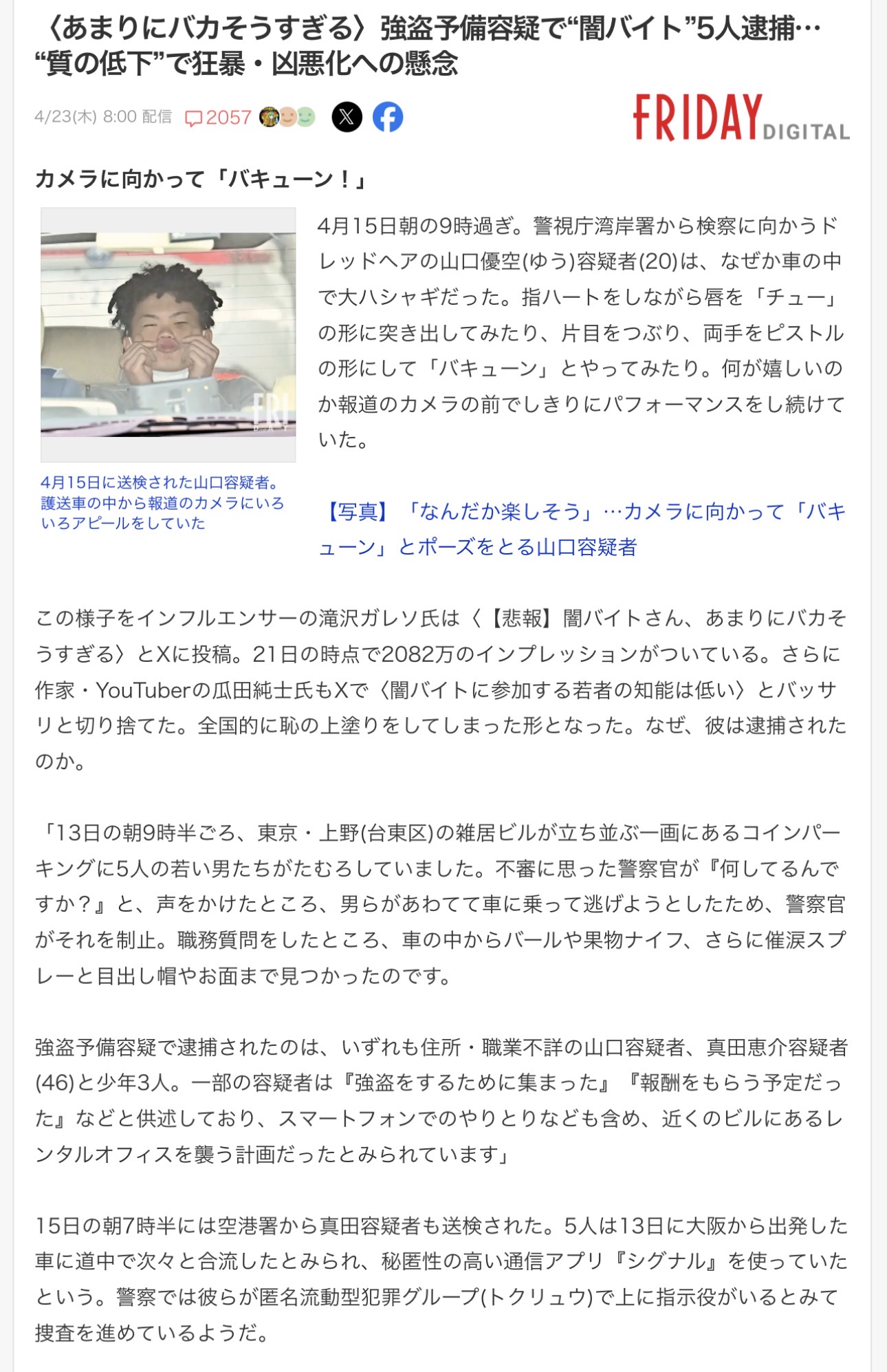 | … | 88無念Nameとしあき26/04/23(木)18:41:38No.1402882924+>検察に向かうドレッドヘアの山口優空(ゆう)容疑者(20)は、なぜか車の中で大ハシャギだった。指ハートをしながら唇を「チュー」の形に突き出してみたり、片目をつぶり、両手をピストルの形にして「バキューン」とやってみたり。何が嬉しいのか報道のカメラの前でしきりにパフォーマンスをし続けていた。 |