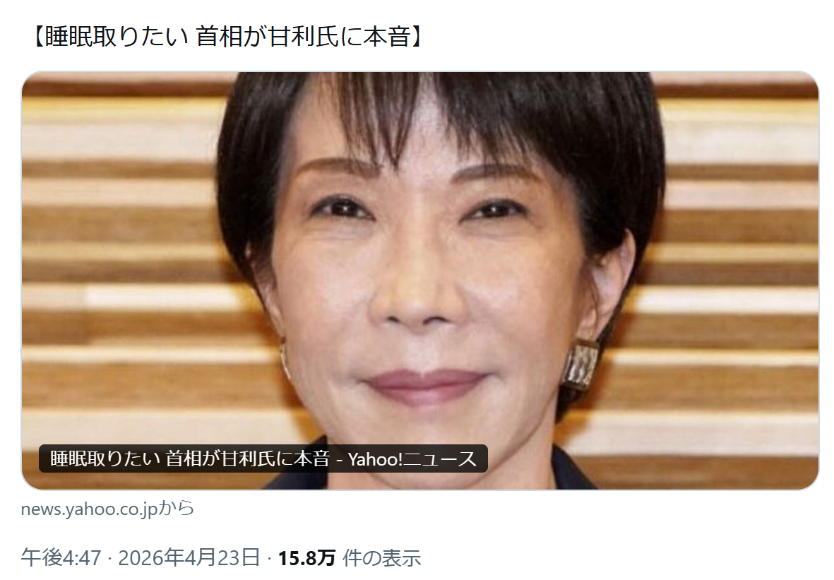 | … | 32無念Nameとしあき26/04/23(木)18:48:55No.1402884336+ひどい…睡眠障害だった甘利さんに睡眠に関してのアドバイスを求めてるほどなのに |