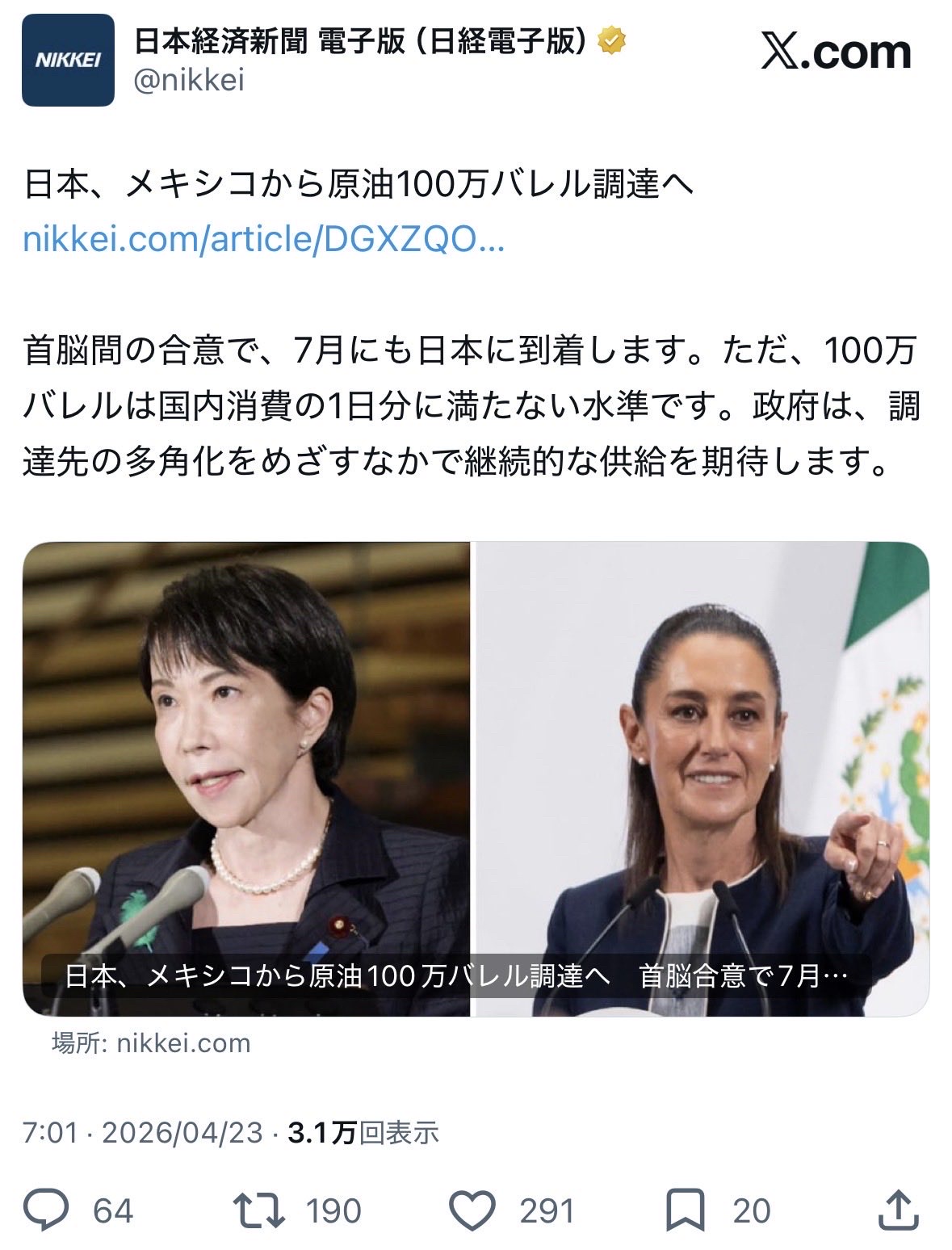 | … | 174無念Nameとしあき26/04/23(木)19:35:41No.1402895186+>メキシコ産油国なのかと調べたら日産最大150万バレルとあってずっこけたんですが |