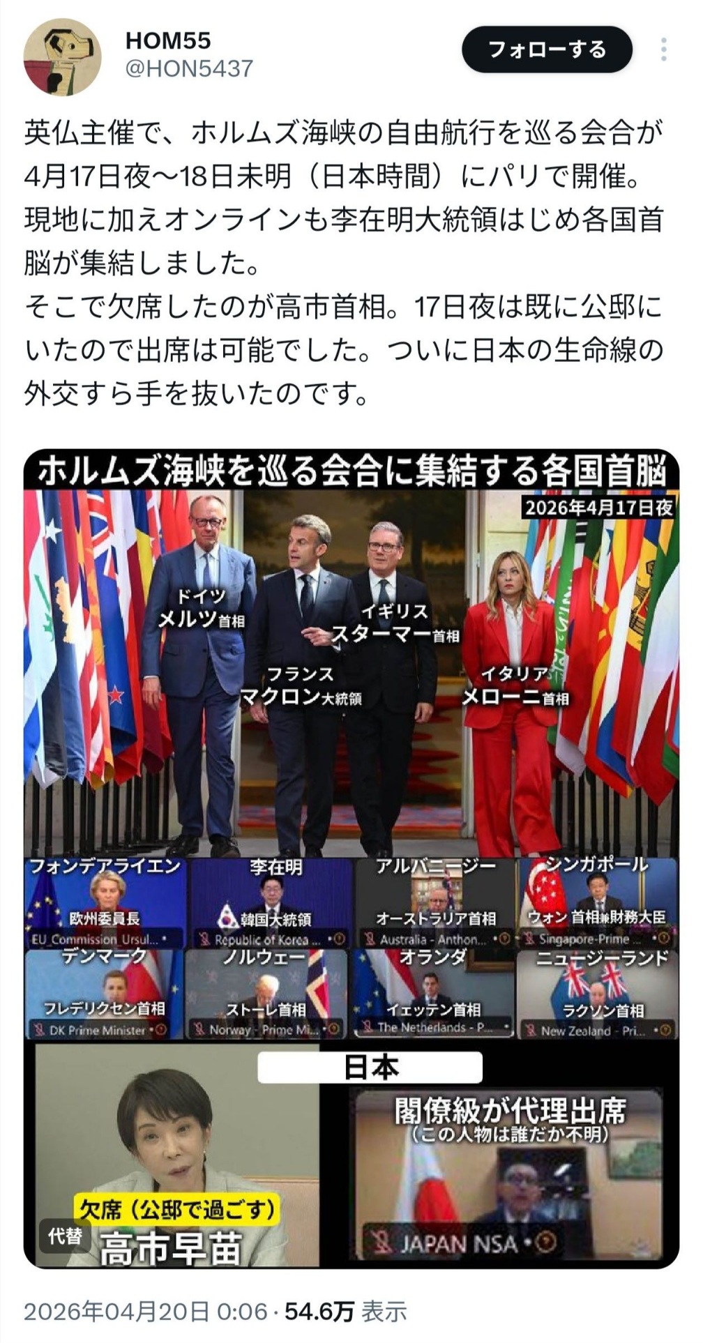 | … | 49無念Nameとしあき26/04/23(木)18:54:16No.1402885414そうだねx2>そもそも首相動静とかいってオールドメディアがストーキングしてるのおかしいだろ |