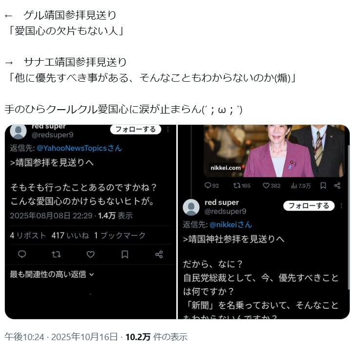 | … | 175無念Nameとしあき26/04/23(木)19:36:07No.1402895282そうだねx2 1776940567802.png-(290772 B) 靖国参拝も放り投げてるけどなぜか信者はそこ批判しないよな |