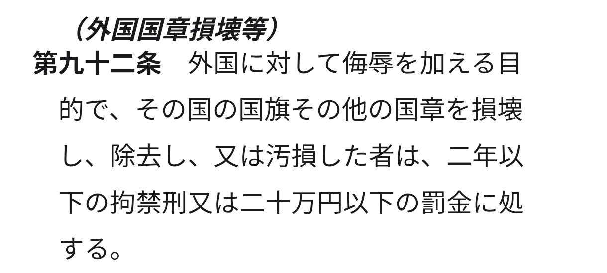 | … | 89無念Nameとしあき26/04/23(木)22:59:02No.1402949167そうだねx3「国旗を貶める意図で棄損した場合」って書けば良いのに |