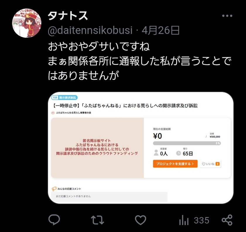 | … | 72無念Nameとしあき26/04/24(金)13:08:07 ID:mByOYESkNo.1403033942そうだねx1>関係各所に通報しているらしいが…? |
