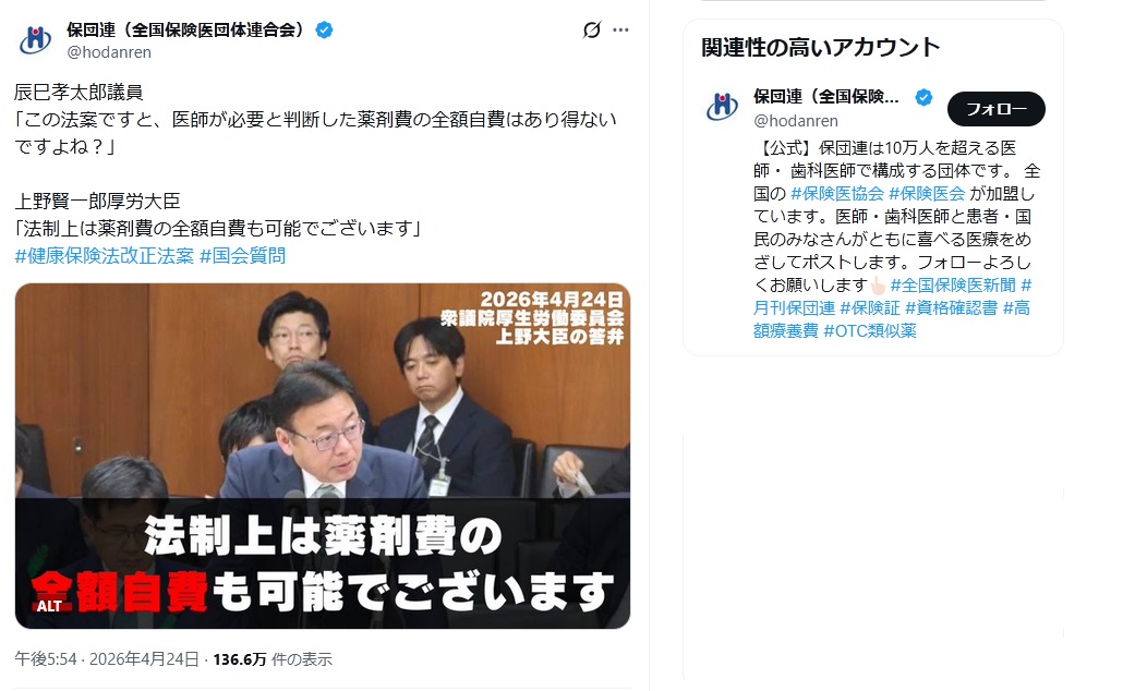 | … | 44無念Nameとしあき26/04/25(土)19:31:19No.1403343836そうだねx9 1777113079509.jpg-(173160 B) 医者が必要と判断して処方しても全額自己負担になる可能性がある |